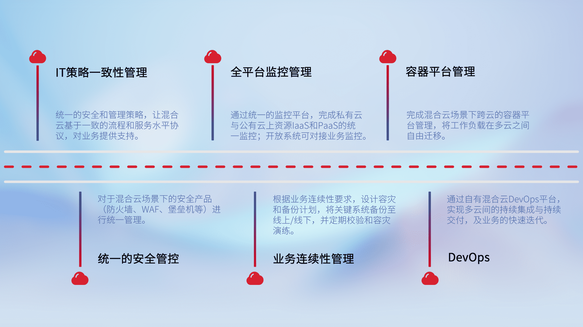 通过多云纳管,,,,以统一的资源数据模型把客户的云资源进行抽象和封装,,,,进而实现对多云资源的统一操作,,,,保障云资源管理的可靠性、、、稳定性与可用性。。。量身定制化运维内容,,配置、、、、开发运维、、、、补丁管理、、、备份、、、、监控、、、、认证和访问管理、、、、审计和日常巡检等,,,保障在用云过程中的可靠度,,,稳定度以及高可用率。。。。