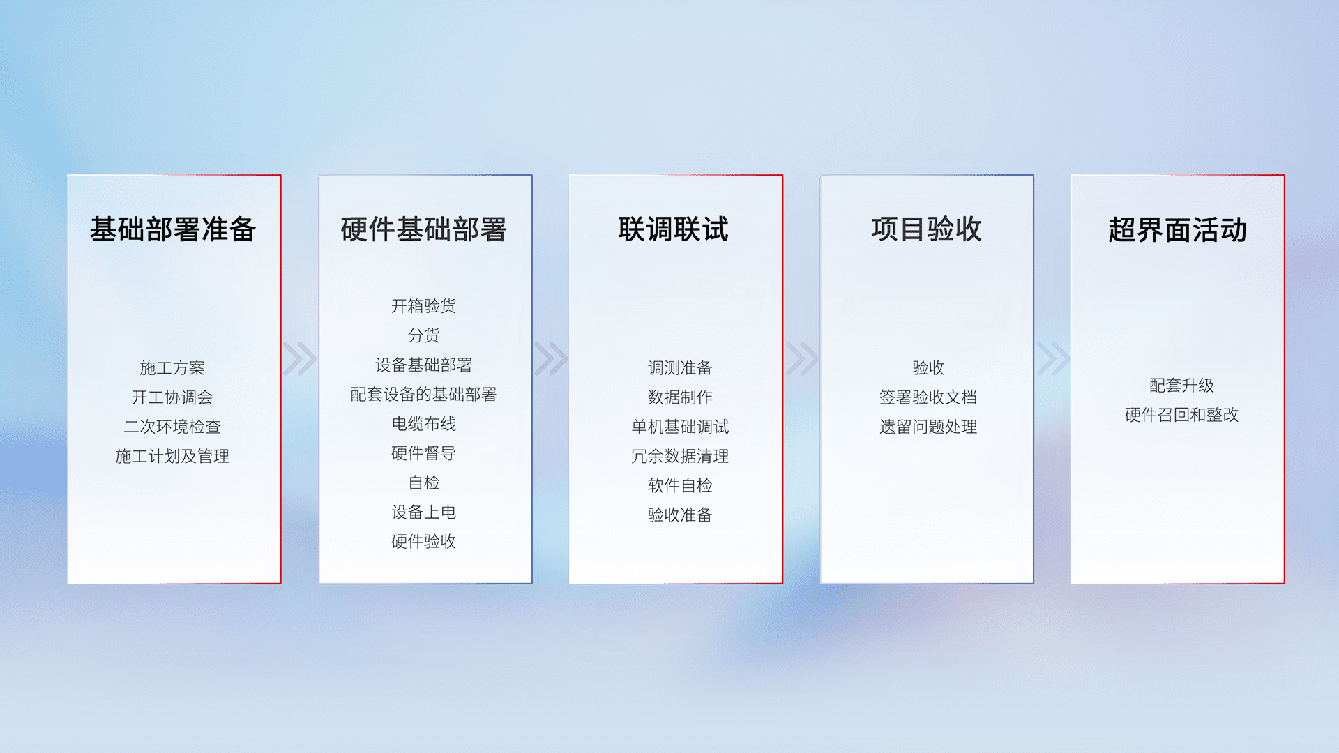 从基础部署准备、、、、硬件基础部署、、、、联调联试、、、、项目验收、、越界面活动的全过程可追溯,,,保证施工质量和进度。。。