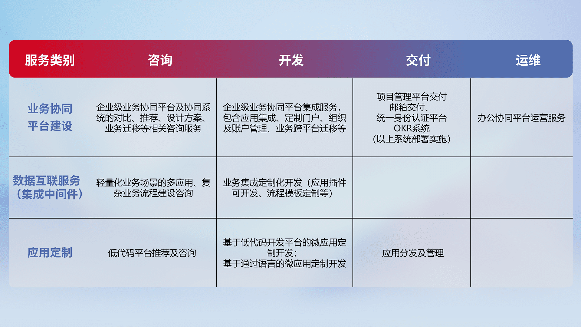 针对钉钉、、、企微、、IDaas等平台级产品提供产品的规划、、、方案、、交付、、、、定制化开发等服务,,,,实现如统一协同办公、、、、智能客户服务、、混合会议管理、、智能数据查询、、、等业务场景,,,,实现数字化转型。。